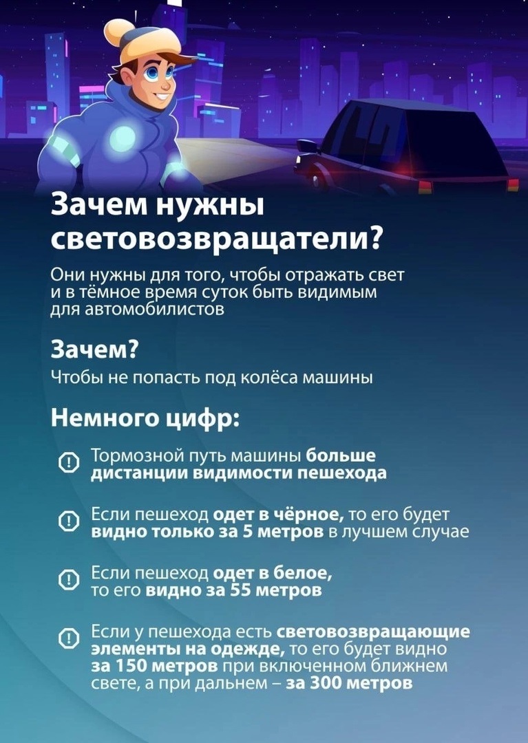 Одно из самых распространенных ДТП — это наезд на пешехода, которого не видно в темноте или в непогоду. На расстоянии нескольких десятков метров обозначить присутствие человека может даже небольшой световозвращающий элемент на одежде, обуви или аксессуарах.